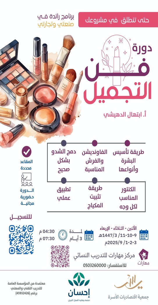 ضمن برنامج رائدة في صنعتي وتجارتي، انطلقت أولى البرامج التدريبية في مجال فن المكياج، وذلك بهدف تمكين المشاركات من اكتساب المهارات الحرفية وفتح آفاق جد...